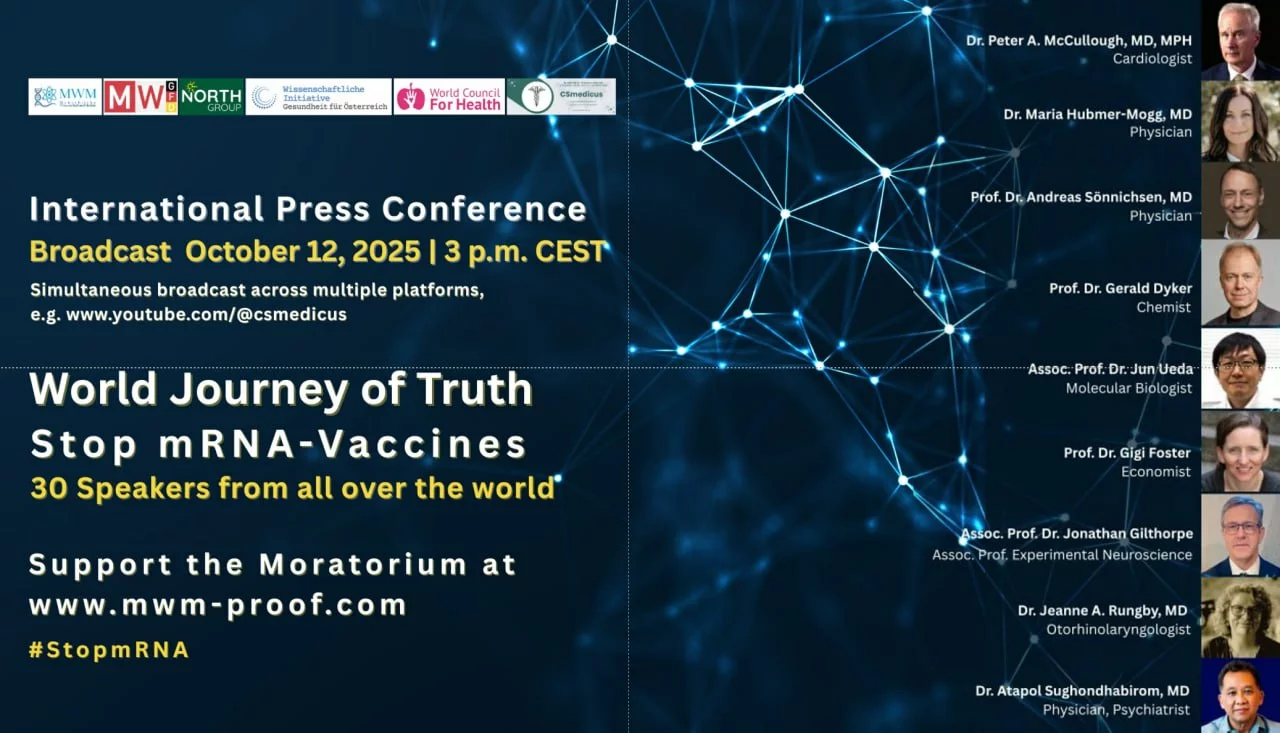 Am 16.9.25 fand eine Pressekonferenz statt, die zu einem sofortigen Moratorium der mRNA-Impfungen aufforderte. In kurzen, gut verständlichen Redebeiträgen erfährst Du, warum. Auch Du kannst aktiv werden, um Dich, Deine Kinder und Enkelkinder zu schützen und diese wichtige Forderung hunderter Wissenschaftler zu unterstützen. Die links zur Aufzeichnung und zur Unterzeichnung findest Du unten.